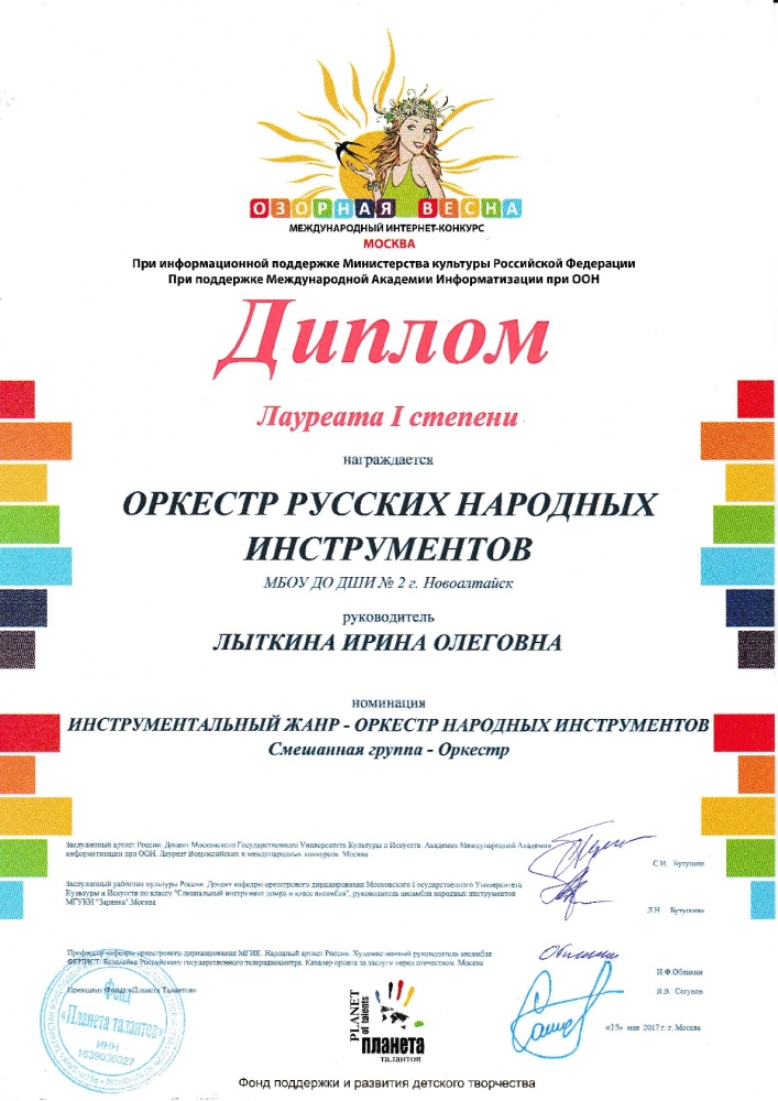 Оркестр Русских народных инструментов (рук. Лыткина И.О.) принял участие в Международном интернет-конкурсе "Озорная весна" и "забрал" диплом Лауреата I степени. Так держать!