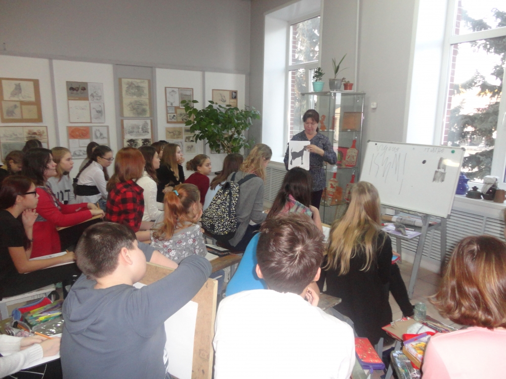Открытие выставки – это не всё, что ждало гостей мероприятия, Лидия Юрьевна подготовила и провела мастер-класс по наброску для учащихся ДШИ №2. Селезнёва Лидия Юрьевна – член Союза художников России, председатель цикловой комиссии специальности «Живопись» и преподаватель Новоалтайского государственного художественного училища начала свой рассказ с того, что такое набросок. Художник рассказала о том, как правильно пользоваться штрихом, точкой, пятном и линией. Рассказывала на примере набросков с выставки и, в процессе, сама рисовала на доске и бумаге. Затем ребята, под чутким руководством Лидии Юрьевны выполняли практические задания. Мягкими материалами (соус, сепия, сангина, пастель), а также, акварелью, участники мастер-класса сделали набросок натюрморта пятном – предметы стояли на подоконнике, против света, чтобы хорошо был виден силуэт. В этой же технике был выполнен набросок с натуры фигуры человека. Далее, по заданию художника, ребята любовались натюрмортами из необычных по форме предметов и рисовали их линией, передавая образ и настроение. В конце мероприятия Селезнёва Л.Ю. провела просмотр работ – ребята выложили все сделанные за мастер-класс наброски. Лидия Юрьевна никого не обошла добрым словом – всем сказала об удачных работах и дала рекомендации к устранению ошибок. И ребята, и Лидия Юрьевна остались довольны, все покинули выставочный зал во вдохновленном настроении.