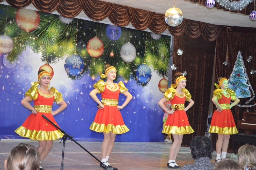Порадовали зрителей и солисты - вокалисты: Даша Перминова (“Зимушка - зима”), Даша Васильева (“Новый год”), Лера Казанцева (“Я буду петь и танцевать”), Аня Калачева (“Колдунья”, Давид Чихрадзе (песня из к/ф “Леон”). Учащиеся хореографического отделения подготовили 7 разнохарактерных танцев. Яркие, красочные костюмы, музыка, выразительность исполнения вызвали бурные аплодисменты зрителей. Хореографический ансамбль “Рассвет” (рук. Снеженко И.Ю.) показал танцы “Тучка”, “Испанские ритмы”, “Подружки”, “Барыня”; хореографический ансамбль “Второе дыхание” (рук. Никитаенко Н.Е.) - “Микки-Маус”, “Сладкая ты моя”, “Звездная страна”. Завершил программу концерта вокальный ансамбль “Колибри” (рук. Логинова С.В.). Весело, задорно в исполнении ребят - вокалистов прозвучала песня “Новый год”, которую “подхватили” учащиеся хореографического ансамбля “Рассвет”. Финал концерта получился очень ярким, зрелищным, радостным, поистине Новогодним! Мы надеемся, что своими выступлениями порадовали зрителей и создали новогоднее настроение у всех, кто пришел на наш праздничный концерт.