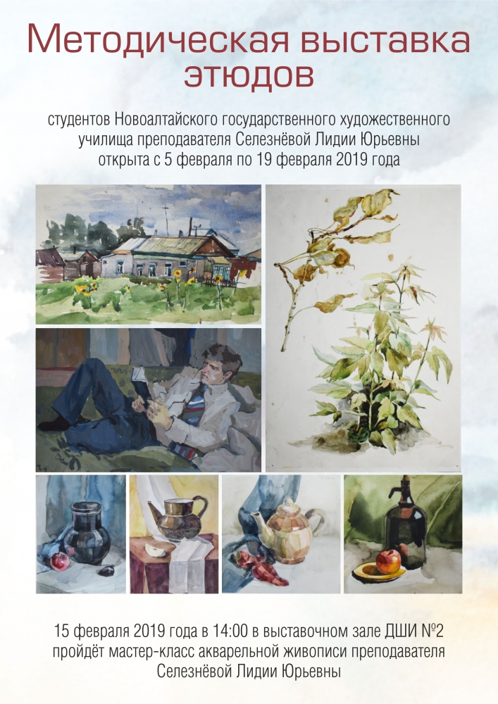 5 февраля в выставочном зале Детской школы искусств № 2 открылась Методическая выставка этюдов, выполненных в технике акварели. В экспозиции представлены работы студентов Новоалтайского художественного училища преподавателя Селезневой Лидии Юрьевны.