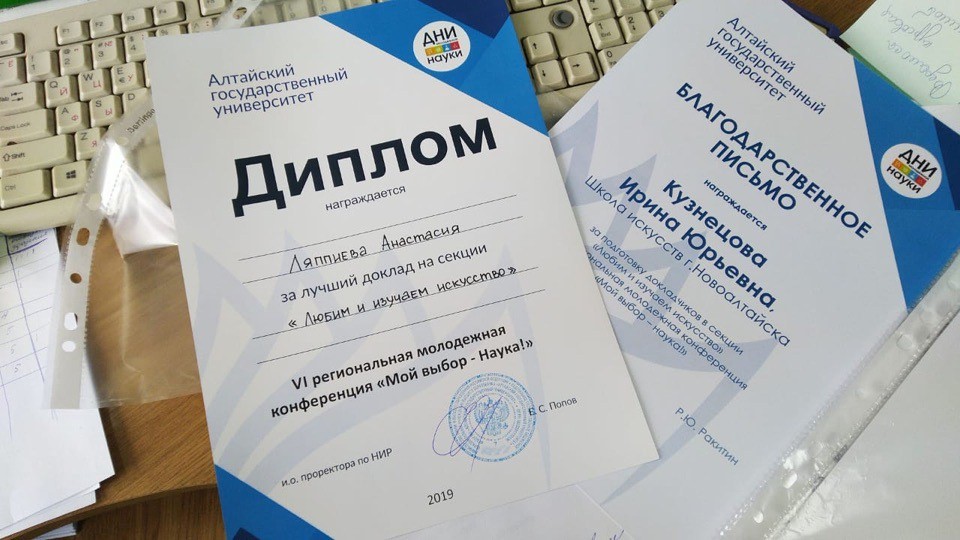 25 апреля 2019 г. на базе Алтайского государственного университета прошла VI региональная молодёжная конференция «Мой выбор – наука!», в которой приняла участие учащаяся 3 класса художественного отделения - Ляппиева Анастасия. На конференции Анастасия выступила с докладом «Религиозная тематика в произведениях итальянского художника эпохи Возрождения Якопо Тинторетто (Робусти)» и была награждена дипломом за лучший доклад на секции «Любим и изучаем искусство».