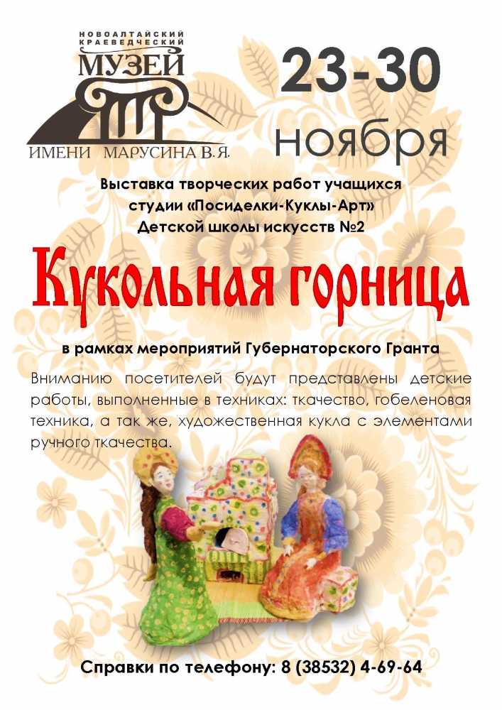 С 23 ноября по 30 ноября в Новоалтайском краеведческом музее им. В.Я. Марусина экспонируется выставка творческих работ учащихся художественного отделения Детской школы искусств № 2, участников студии декоративно-прикладного творчества “Посиделки-куклы-Арт”.