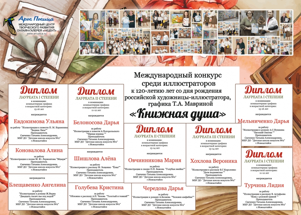 Дипломом Лауреата I степени Международного конкурса среди иллюстраторов «Книжная душа» награждены учащиеся: