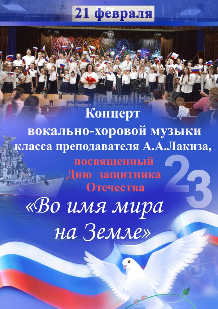21 февраля 2023 года в концертном зале Детской школы искусств №2 г. Новоалтайска состоялся концерт вокально-хоровой музыки, посвящённый Дню защитника Отечества под названием «Во имя мира на земле». Патриотизму нельзя научить. Его надо воспитывать в полном смысле этого слова с пеленок, когда образное слово, эмоции, чувства значат больше, чем разум. Быть настоящим гражданином и патриотом своей страны – это значит любить и гордиться своей Родиной, уважать и соблюдать законы государства, выполнять свои обязанности, быть активным в общественной жизни, беречь и умножать богатства родного края. Каждый гражданин Российской Федерации должен знать её историю, символику и традиции. Настоящий патриот России бескорыстно любит свою страну, гордится ею, готов отдать все силы, знания на благо Родины, её процветание, а если понадобится – защитить её. Артисты, которые вышли на сцену в этот вечер, показали себя настоящими патриотами, исполнив произведения с большим чувством ответственности и воодушевления. В сводном хоре ДШИ №2 занимается более 120 детей разного возраста.