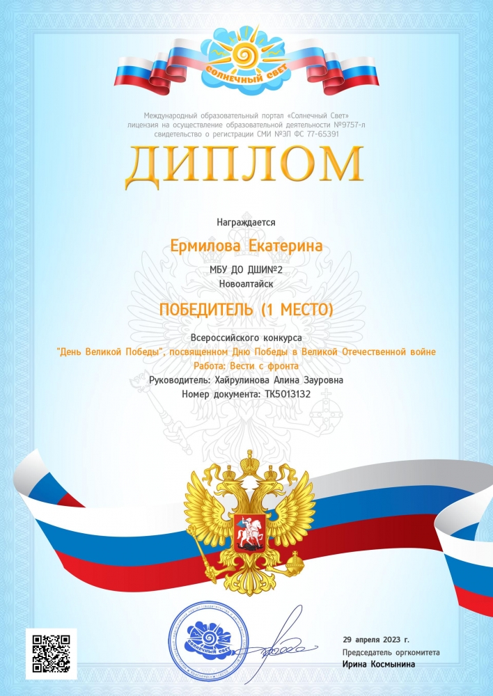 1. Всероссийский конкурс детско-юношеского творчества, посвященного Дню Победы "Салют Великой Победы!" г. Санкт-Петербург: