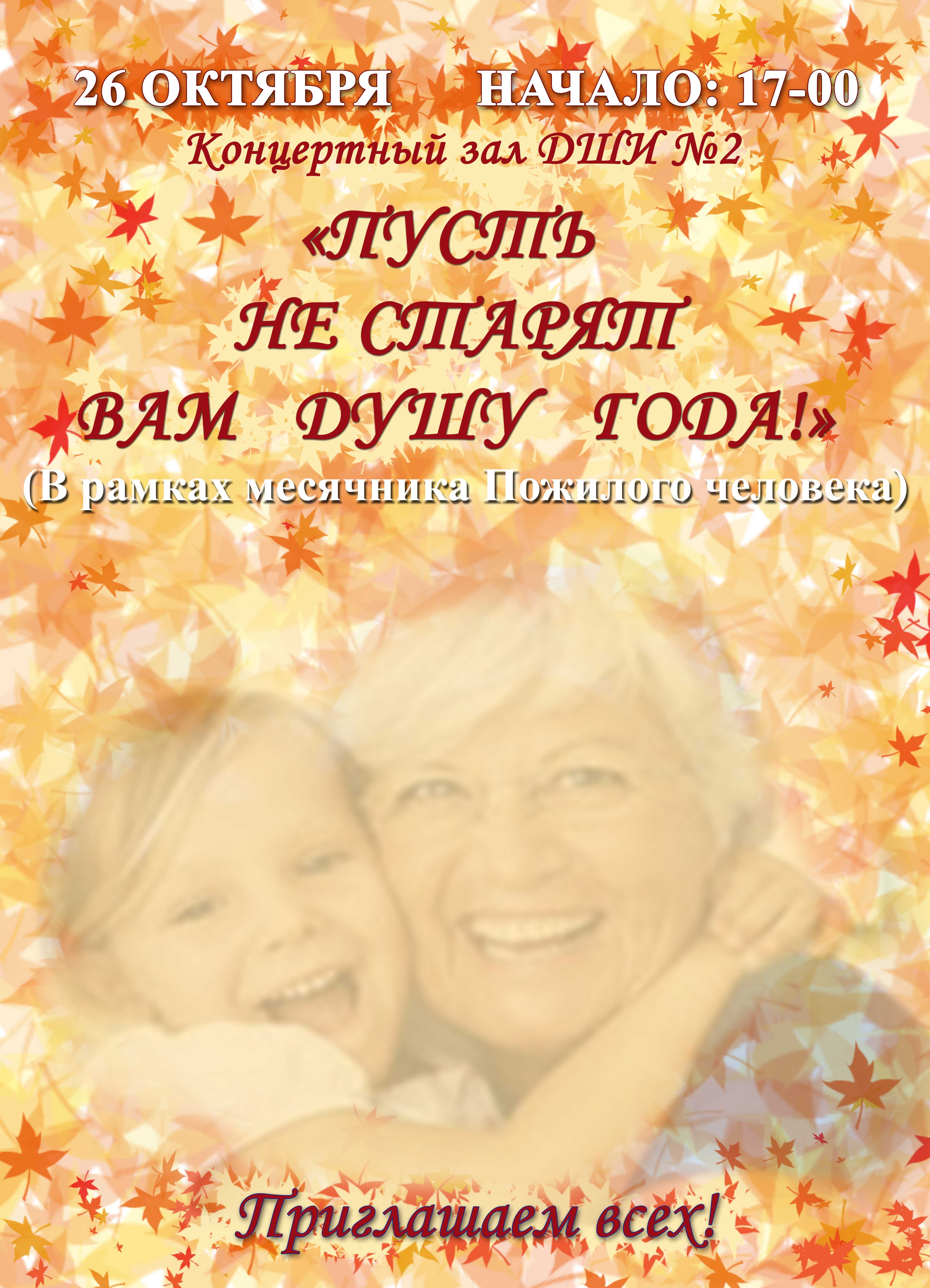 Приглашаем на концерт "Пусть не старят Вам душу года!", который проводится в рамках месячника Пожилого человека.