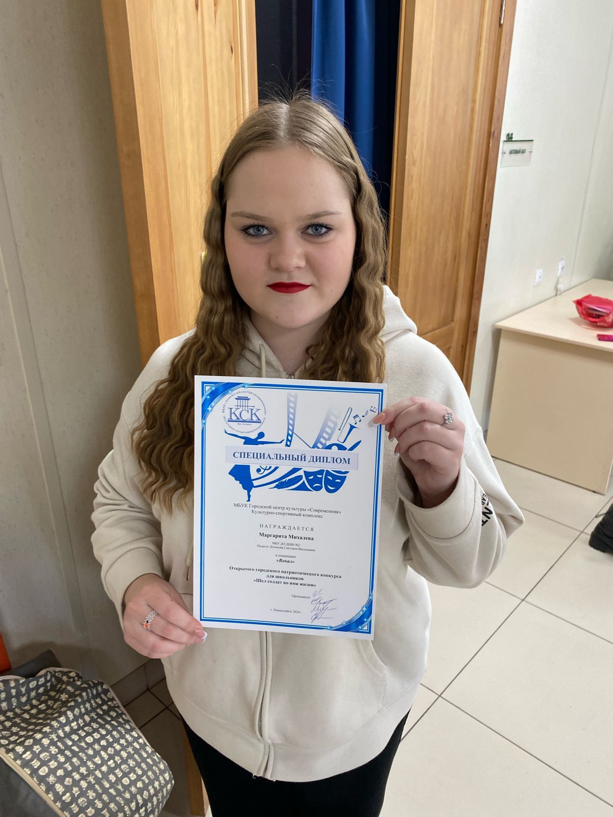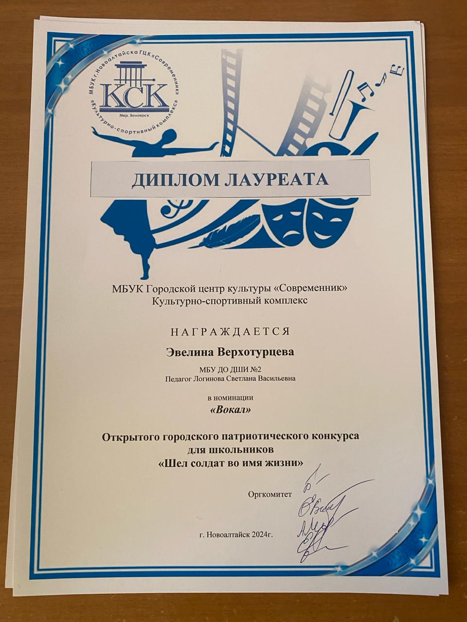 19 февраля в Белоярском Культурно-спортивном комплексе г. Новоалтайска прошел Открытый городской патриотический конкурс песен и стихов для школьников. Это был первый конкурс в формате: «Стихи и песня». Учащиеся старших классов преподавателя вокала Логиновой С.В. неизменно подтвердили свой исполнительский уровень дипломами Лауреатов: Казанцева Валерия, Верхотурцева Эвелина, Михалева Маргарита.