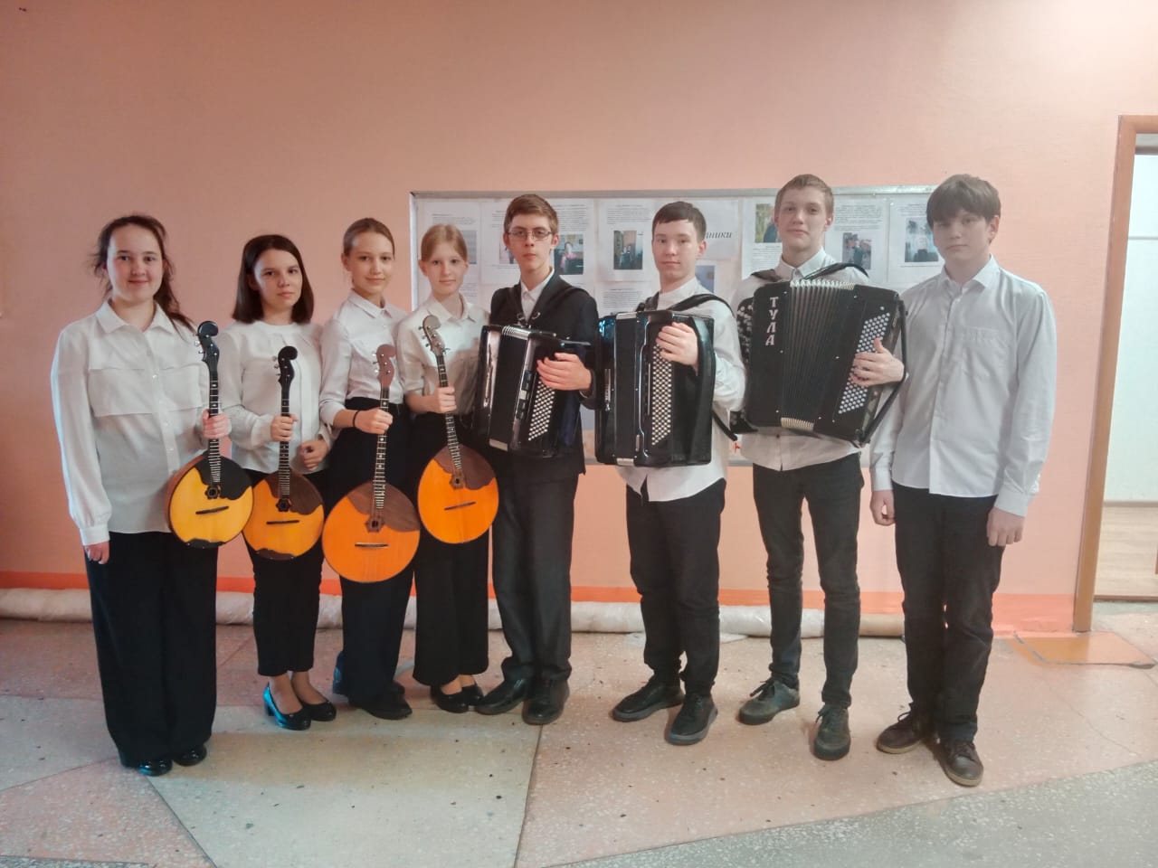 От нашей школы приняли участие: Ансамбль русских народных инструментов «Веселые ребята» (рук. Григорьева Е.Ю., Меркулова О.М.), и учащаяся 5 класса Ульянчева Валерия (пр. Меркулова О.М.).
