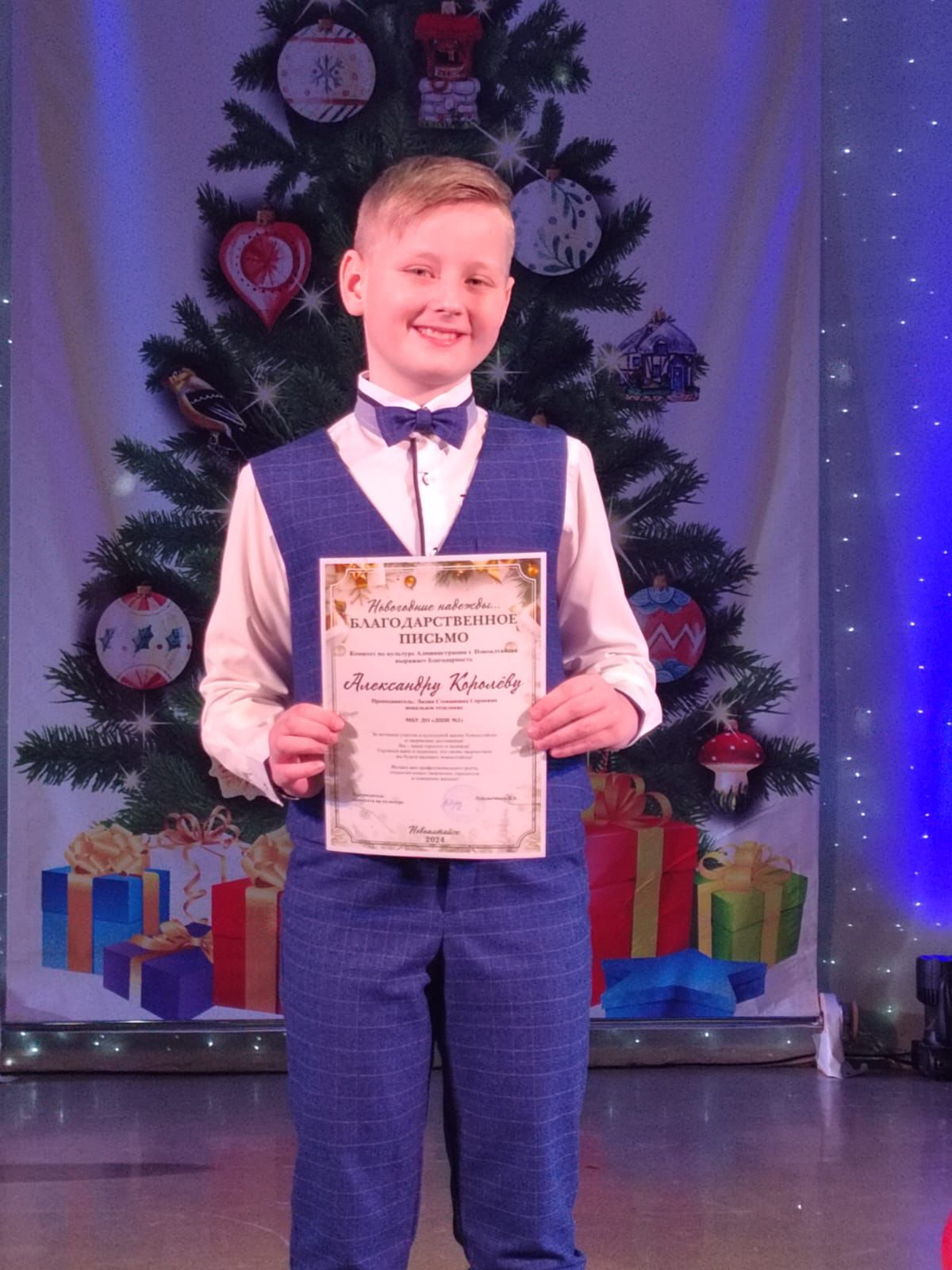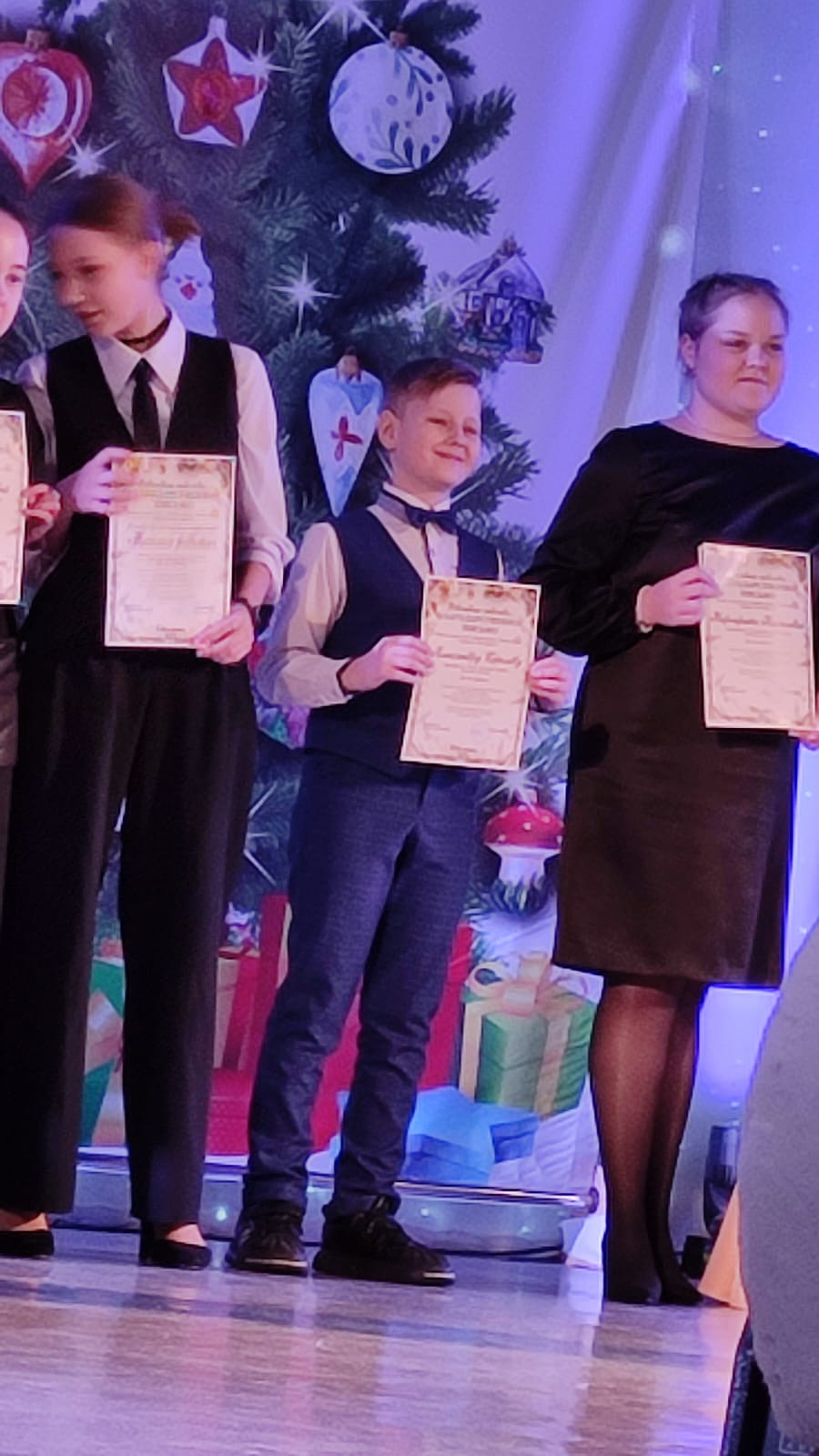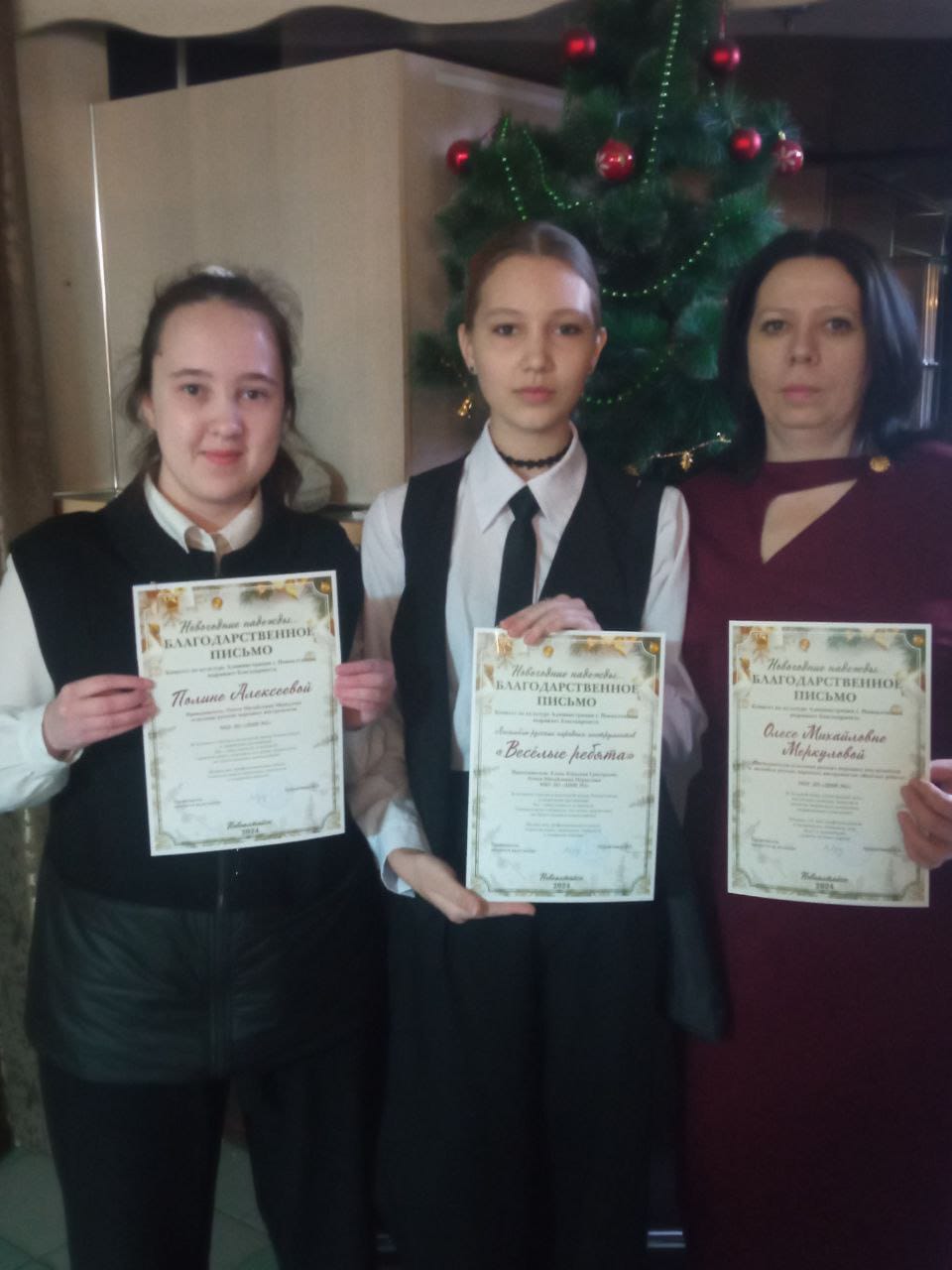Благодарственными письмами за активное участие в культурной жизни города и творческие достижения были награждены: Хайдаров Антон (преп. Полухина Н.Н.), Хайдаров Илья (преп. Полухина Н.Н.), Богун Алиса (преп. Гюнтер Е.В.), Алексеева Полина (преп. Меркулова О.М.), Королёв Александр (преп. Сорокина Л.С.), Перминова Дарья (преп. Сорокина Л.С.), Щекалёва Валерия (преп. Сорокина Л.С.), Михалёва Маргарита (преп. Логинова С.В.), Куценко Анна (преп. Логинова С.В.), Пухтеева Полина (преп. Логинова С.В.), Караваева Ольга (преп. Хайрулинова А.З.) и Ансамбль русских народных инструментов «Весёлые ребята» (преп. Григорьева Е.Ю., Меркулова О.М.).