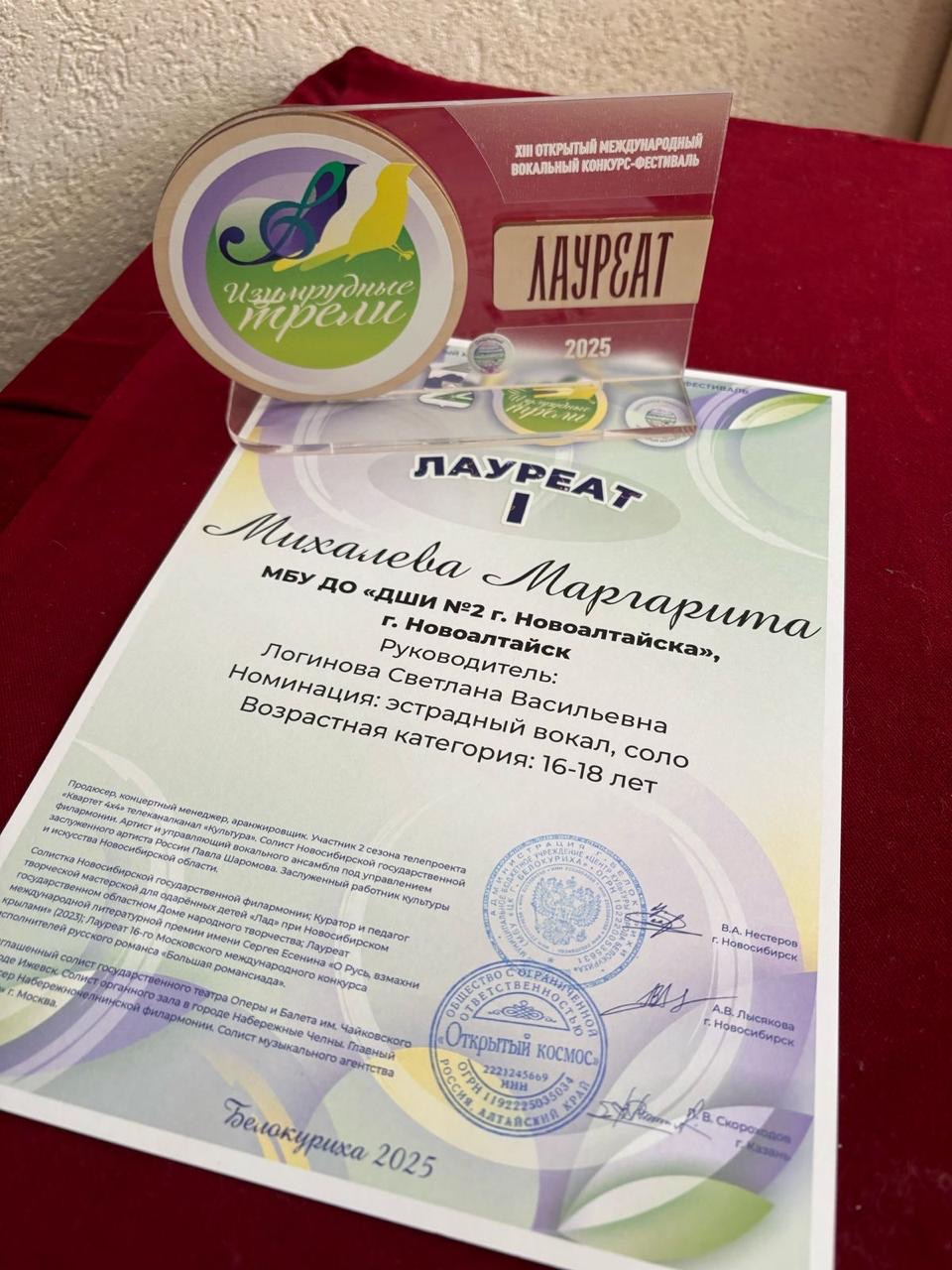 ДШИ №2 г.Новоалтайска представляла ученица вокального отделения Михалева Маргарита (класс преп. Логиновой С.В.). Получив высшие оценки жюри, Маргарита 19 апреля с честью выступила на Гала-концерте вокального конкурса «Изумрудные трели».