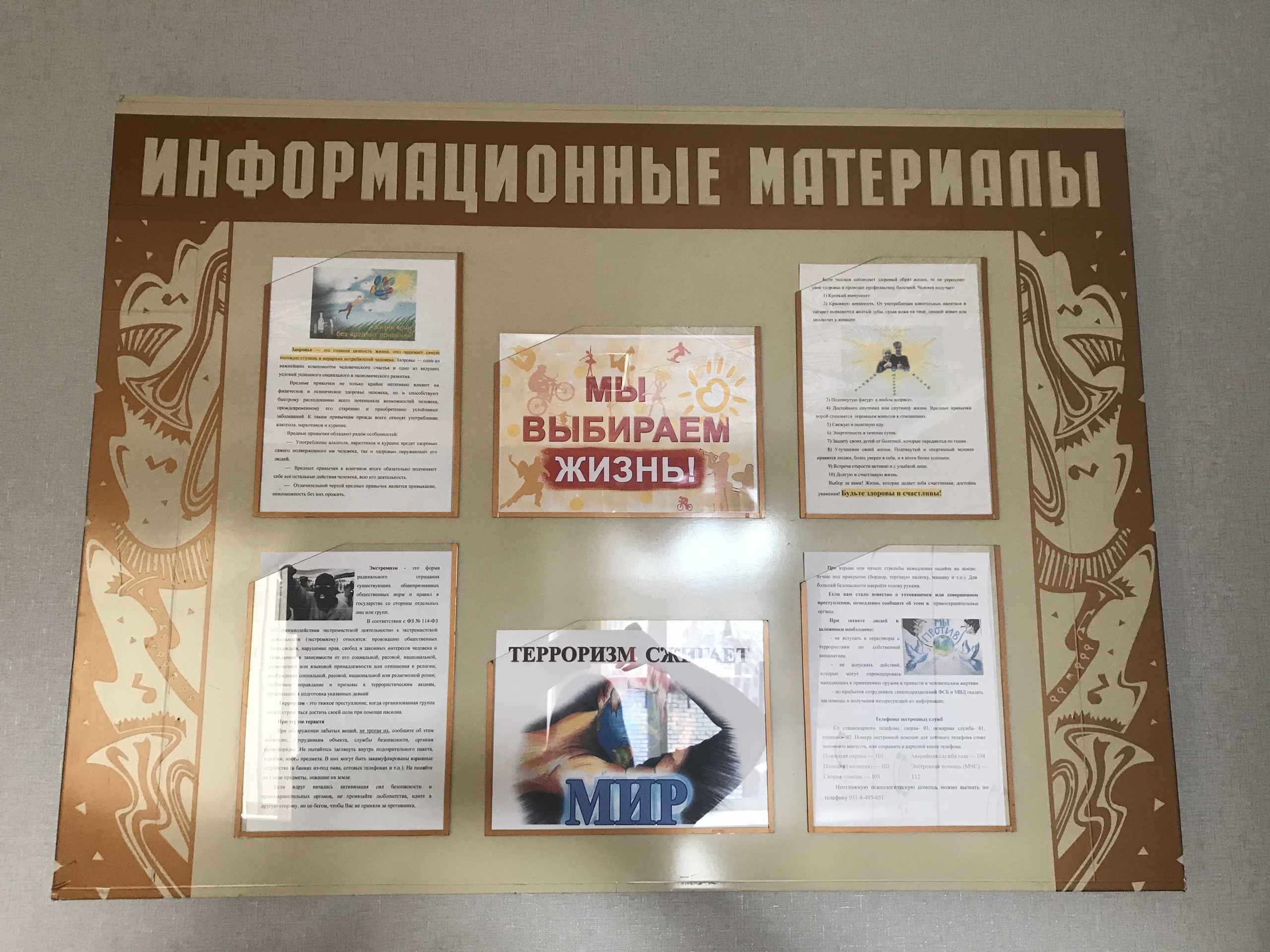 В школе по полугодиям проводятся следующие мероприятия: учебная тревога, проводятся инструктажи с учащимися классов, классные часы по вопросам здорового образа жизни, в школе имеется наглядная агитация, которая размещена поэтажно, оформлен стенд "Мы выбираем жизнь!" в соответствии со следующими локальными актами: