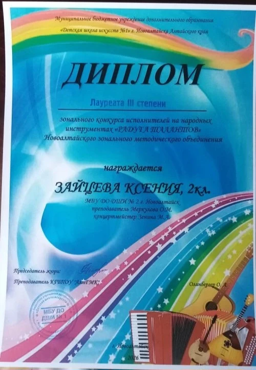 Зайцева Ксения (домра) -Лауреат III степени (преподаватель Меркулова О.М.)