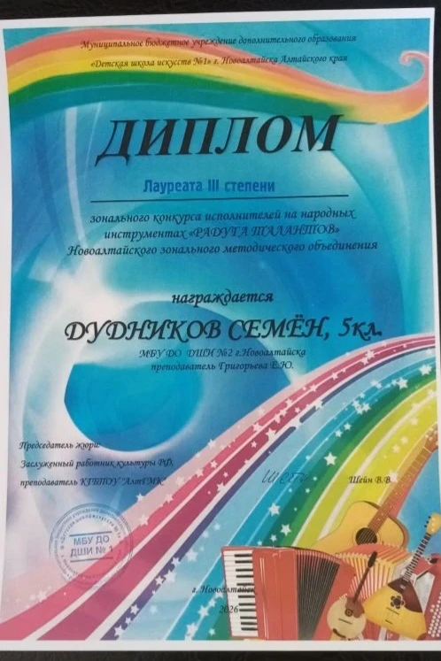 Дудников Семён (баян)-Лауреат III степени (преподаватель Григорьева Е.Ю.)