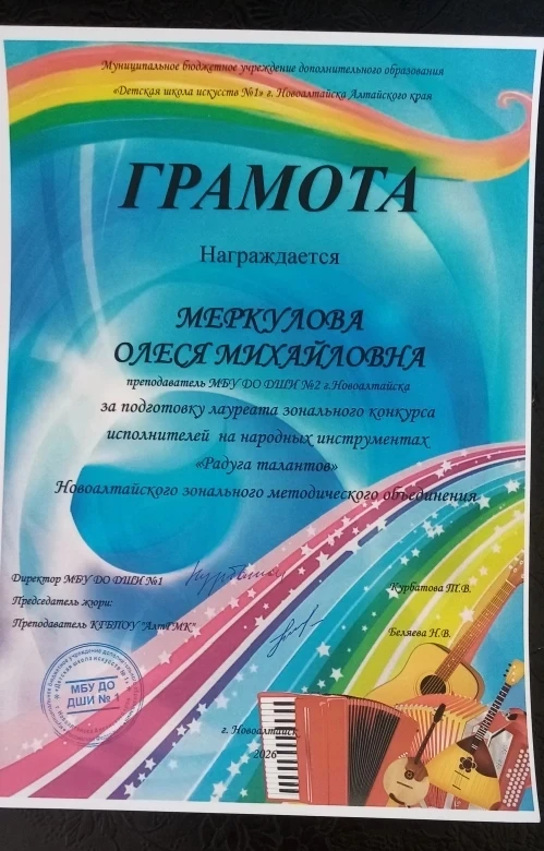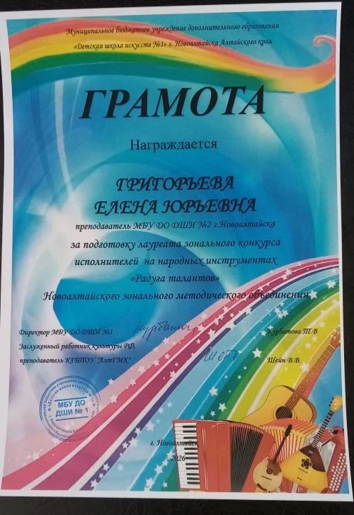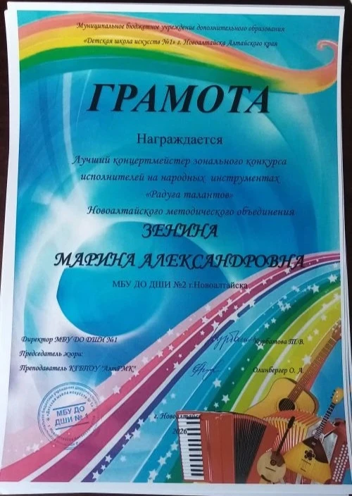Преподаватели и концертмейстер Зенина М.А. отмечены грамотами за подготовку лауреатов конкурса.